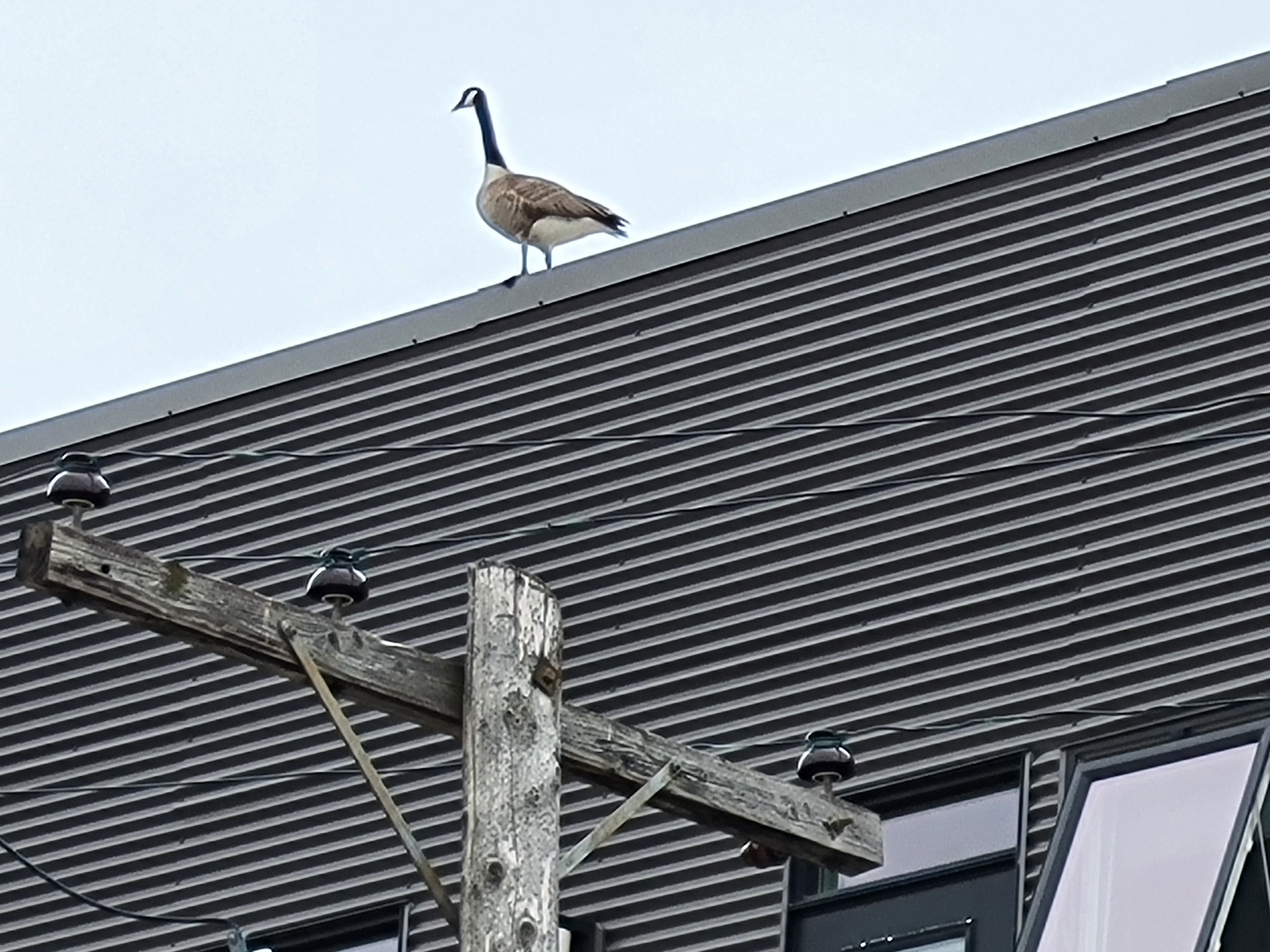 Almost every morning a lone goose appears regularly on the roof of the condo development across the back lane. Since it is alone, I have no way of comparing neck sizes, but it is loud and since male geese have a louder honk than female ones, I am guessing that this is a male.