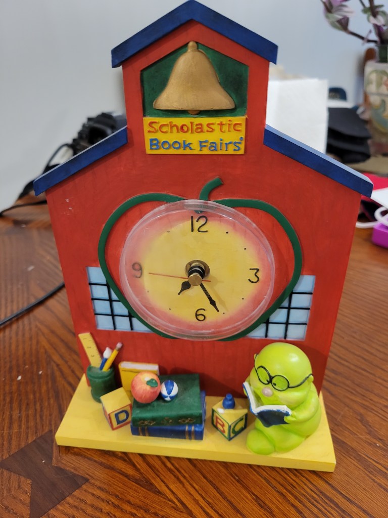 Take, for example, this Scholastic Book Fair clock, complete with bookworm. The clock works, which is a bonus. I put in the beginning bid of $5 and no one bid against me, another bonus. Best of all, every time I look at it I am reminded of the annual Scholastic Book Fair at the school my children attended. The book fair was a big deal.