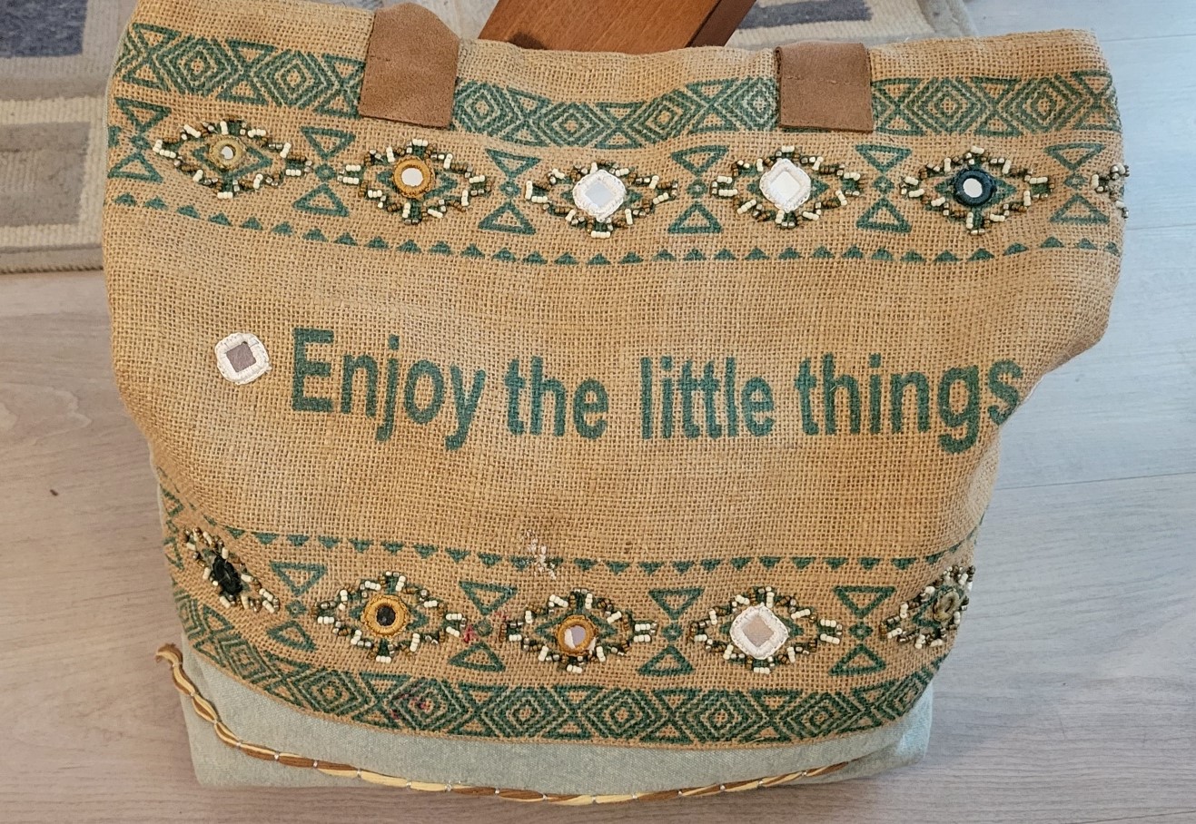 The tote bag I am carrying around this summer features the words “Enjoy the little things” on its front.