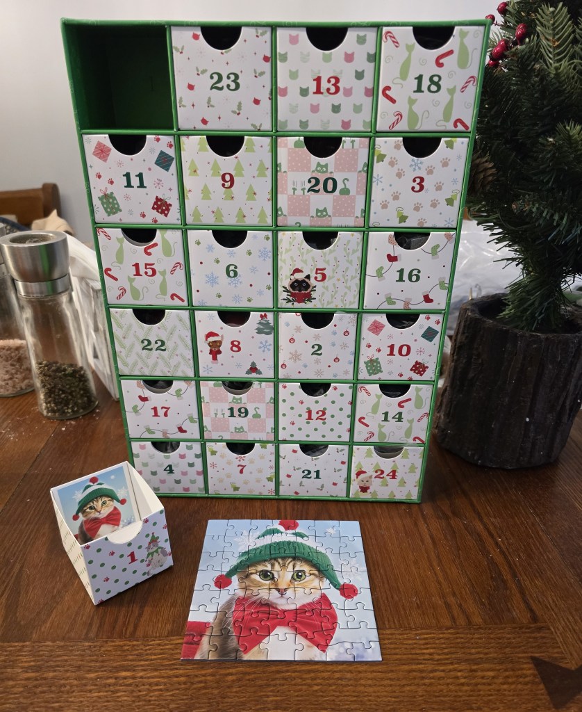 There are the 24 50-piece cat puzzles – perfect for a 10-minute break with a cup of coffee. I give it bonus points because I can put it away and do the puzzles again next year if I so choose.